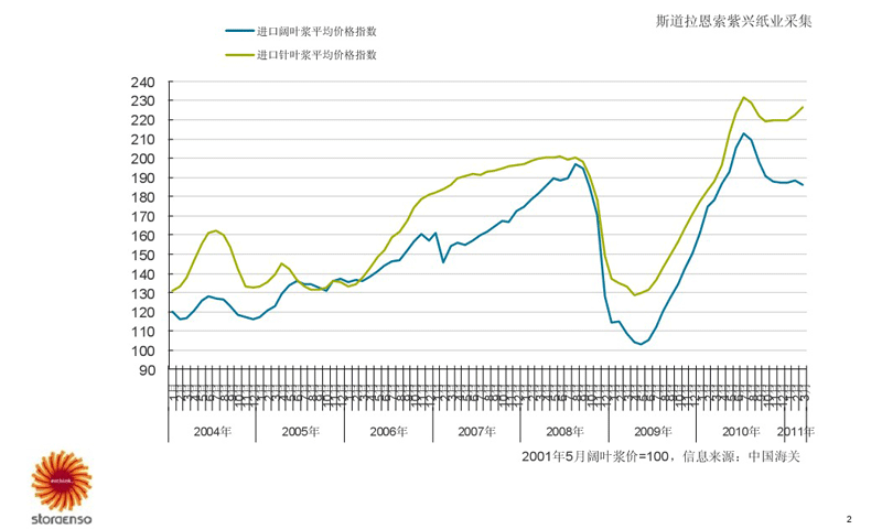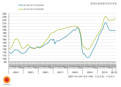 國內(nèi)進口紙漿價格指數(shù)趨勢圖(2001年5月份=100)