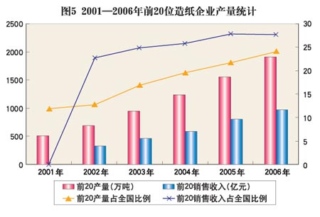 圖5 2001-2006年前20位造紙企業(yè)產(chǎn)量和銷售收入統(tǒng)計