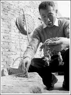 前面提到準備原料的繁瑣過程,其目的就是要將構樹皮中的纖維充分軟化。在這個過程中不能使用任何的機械,必須由手工完成,如果使用機械,將會破壞纖維的韌度影響紙張的質量。介紹到這兒,馬勝松猛吸了一口手中的香煙接著說:“造紙的整個過程下來,有18道大工序,72道小工序,每個工序都少不了。這些工序都是祖上一輩輩手把手傳下來的。現在的年輕人嫌麻煩,干這個賺錢又少,沒人愿意學。我家的三個娃,現在都出外打工了,平時回來對我造紙連看都不看。”古工藝后繼無人,同時又面臨著來自國外的壓力。記者在采訪時得知這樣一件事:1982年末的一天,北張村接上級通知要求整理村容迎接外賓。之后村里來了一輛載滿日本客人的大客車,這些客人到村里后,最關心的就是造紙古工藝的過程,他們對整個的過程進行了錄像并作了認真的記錄。馬勝松當時也受邀請為日本客人演示了造紙過程,其中一位日本人回國后給馬勝松寄來了一張《唐人造紙流程圖》和一些日本手工制造的紙張。讓馬勝松驚奇的是,在寄來的那張圖上,日本人根據當時參觀造紙的記錄情況,以圖畫的形式詳細繪出了造紙古工藝的整個過程。說到這兒,一臉厚道的馬勝松表現出對日本“客人”這種做法的不滿。