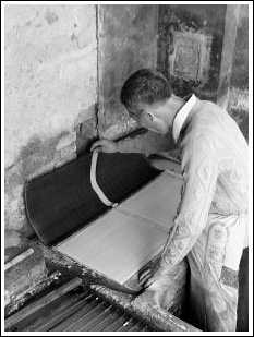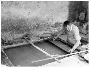 記者問馬勝松:“現在還有沒有人會用手工方法造紙?”他笑了,說:“當然有了,我現在還經常造著呢。”說著,他便系緊圍裙跳進緊挨紙槽,只能容下一人站立的小坑中撈起紙來。只見他先用一根木棍在紙槽中輕輕攪動,等沉淀在下面的紙漿均勻地漂浮在水中后,再拿起紙槽邊的竹簾,放在一個大小與之匹配的木框上。接著,他雙手托住木框,將框邊以約30度斜角插入水中十厘米左右,稍停頓一下又麻利地從水中抽出。