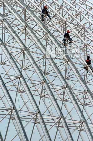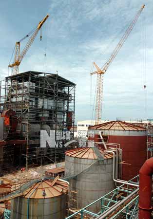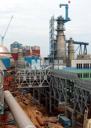 7月14日,中國對外建設海南公司的職工正在金海漿紙廠燃料動力車間施工。海南金海漿紙廠由印度尼西亞金光集團投資75億元人民幣在海南洋浦經濟開發區建設,設計年產紙漿100萬噸,是目前世界上在建的最大紙漿生產線。該廠主要生產設備從芬蘭、瑞典等國引進,具有世界一流的先進水平,噸漿耗水量為40噸,而國家標準是220噸,用水量大大減少,其它主要排放標準均不到國家標準的三分之一。該廠目前已經完成投資65億元,將于今年10月1日正式投產。投產后將大大緩解我國紙漿制品大量依賴進口的現狀。(新華社記者姜恩宇 攝)