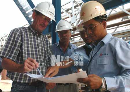 7月14日,美國專家喬治·羅(左一)和德國專家沃勒爾·索瓦斯克(中)在漿紙廠工地和中方專家研究設備安裝。