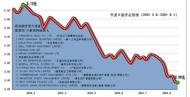2004年7月22日,帝賢B就增發發出公告說:“經中國證券監督管理委員會證監發行字[2004]101號文批準,承德帝賢針紡股份有限公司獲準定向增發不超過15000萬股境內上市外資股(B股)。公司于2004年7月15日發布信息備忘錄、招股說明摘要和發行公告,并于2004年7月19日至20日向境外機構投資者定向增發B股。增發股票部分已由投資者認購,余額由南方證券股份有限公司包銷,根據相關文件,發行工作結束。”
