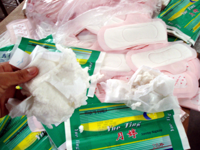 工商執法人員在檢查中,撕開一些已經包裝好的“高級衛生巾”一看,里面全是碾碎的干紙漿,令人觸目驚心。工商執法人員說,該加工點生產加工的“月婷”、“白牡丹”等女用“高級衛巾”均是冒用他人的廠名、廠址和衛生許可證號,又沒有衛生許可證。現場看到的衛生巾在包裝前沒有經過衛生消毒(現場沒有消毒設備),無疑會給使用者的健康帶來危害。