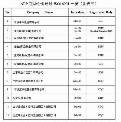 迄今為止,金光集團APP是中國通過國際環保認證ISO14001最多的漿紙業集團,共11家工廠和5家林場通過該國際環保認證(附表三),旗下之寧波中華紙業更是中國第一家通過此認證的造紙企業。