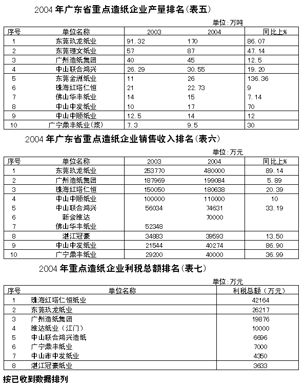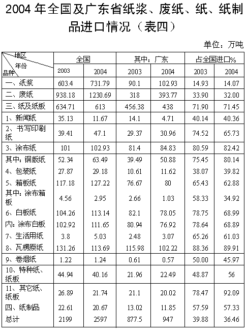 (二)主要經濟指標完成情況 根據有關部門資料,綜合整理2004年廣東造紙生產、消費及主要經濟指標情況。 1、生產總量、消費總量。 2004年生產企業350家左右,生產紙及紙板700萬噸(其中規模以上291家、598萬噸、居全國第三位)消費量1020萬噸,居全國第一位,占全國消費量18.75%,人均消費量123公斤,為全國人均消費量42公斤的2.93倍。 2、2004年全國進口紙漿732萬噸,比上年增加21.39%,其中廣東省進口紙漿103萬噸,比上年增加14.24%,占全國進口量14.07%。全國出口紙漿1.75萬噸,比上年減少30%,廣東沒有出口。 3、2004年全國進口紙及紙板613萬噸,比上年減少3.46%,其中廣東省進口438萬噸,比上年減少4.03%,占全國進口量71.45%,其中用于本省約390萬噸。全國出口紙及紙板124.78萬噸,比上年減少3.34%,其中廣東省出口約90萬噸,比上年減少5.26%,占全國72.8%。 4、2004年全國進口廢紙1231萬噸,比上年增加31.13%,其中廣東省進口394萬噸,比上年增加23.9%,占全國32%。