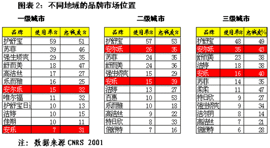 主要表現在:一、主要城市(尤其是一級城市)市場地位表現不盡人意,二、三級市場受到挑戰,消費者使用率和忠誠度等指標逐步下降。(見圖表1和圖表2)
