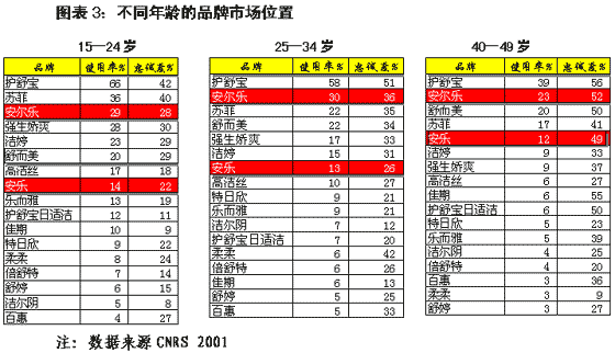 二、缺乏科學的管理與維護,“安爾樂”、“安樂”品牌形象老化嚴重,品牌附件值較低,真正意義上的中高端消費者轉向競爭品牌。如白領女性偏好“護舒寶”、“蘇菲”,“嬌爽”則在年輕女性中擁有較高的市場份額,而“安爾樂”消費群體則偏于中老年化(見圖表3),這對恒安集團未來的發展是個不利信號。