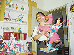 在南昌下水巷10號,63歲的老人徐傳托擁有用廢紙做原料來捏工藝品且捏得栩栩如生的絕活。昨日上午,記者在老人家的客廳內看到了上百件栩栩如生的工藝品,精國英雄岳飛騎馬、雜技表演、理發匠、打鐵匠……