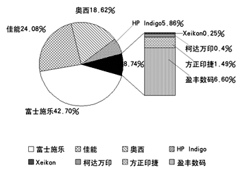 從調(diào)查可以看出,國內(nèi)使用的數(shù)碼印刷機(jī)主要品牌有:富士施樂、HP lndigo,柯達(dá)NexPress、Xeikon、佳能、奧西、方正印捷以及柯達(dá)萬印等。另據(jù)了解,HP公司及IBM公司也在國內(nèi)有一定數(shù)量的用戶。