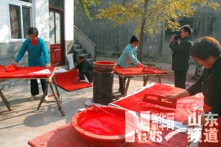 11月1日,山東省郯城縣勝利鄉沙沃村村民在用酸性大紅顏料粉刷紅紙。