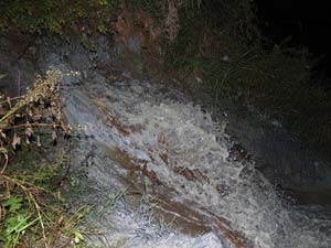 9月25日晚,跟隨當地一位村民來到后灣造紙廠。夜色中,兩扇緊鎖著的鐵皮門內燈火通亮,機器聲轟鳴。這位村民說,造紙廠正在連夜生產。隨后在該廠背后的一片雜草叢中發現,一個十分隱蔽的排污管道正在噴濺著渾濁的污水和泡沫,河灘已經被染成了鐵銹樣的顏色,黏膩的泡沫沾滿了周圍的野草和石頭。