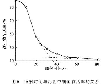 2 1 最佳照射時間的確定照射時間與污泥中細菌存活率之間的關系見圖2。在曲線的拐點處,存活率由急劇下降到緩慢下降階段也是突變率最大的照射時間,而曲線切線的交匯處照射時間約為33s時,正是存活率從急劇下降到緩慢下降的轉折點。這主要是因為在33s以前細菌濃度很高,紫外光照射的效應也很強,因此照射時間越長則突變率越大;超過33s后細菌濃度很低,照射作用的效應變差,輻射的大部分能量被死亡細菌所吸收,從而導致細菌存活率下降緩慢,同樣變異細菌數也將開始減少。根據試驗結果可以確定最佳照射時間為33s,適宜的照射時間范圍為30~40s,這與前人的研究結果相同[2],也與細菌的誘變時間大致相同。