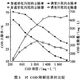 結果表明,在污泥濃度為2g/L、PH值為8.8、培養24h條件下,誘變污泥對COD和木質素的去除效果明顯優于普通馴化污泥,這主要是因為經UV照射后,活性污泥微生物的變異頻率增加,在后期的培養馴化過程中向著更有利于降解纖維素、木質素及其衍生物的方向發展,所以對COD和木質素的去除效果較好。從兩種污泥的絕對去除量來看,普通馴化的污泥在COD為1000mg/L時達到最大,超過這一濃度后去除量開始下降,這可能是由于原水中和木質素降解過程中產生的酚類中間代謝產物具有毒性,抑制了污泥的活性,導致絕對去除量下降。