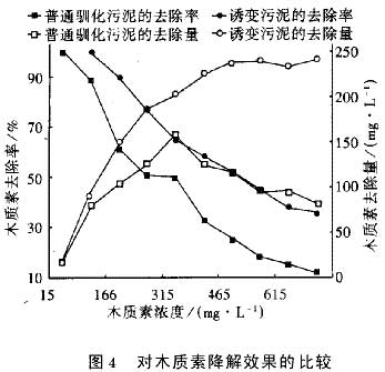 ③活性污泥經誘變后得到降解木質素的多種群生態群體,比單個菌種有更強的競爭力。