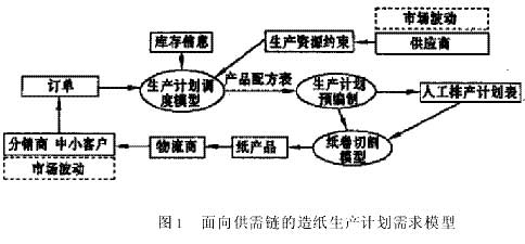 國(guó)外的先進(jìn)造紙企業(yè)自動(dòng)化水平較高,通過(guò)生產(chǎn)管理信息系統(tǒng)中普遍實(shí)現(xiàn)年度或者季度月份的生產(chǎn)計(jì)劃安排,如芬蘭的A.Ahlstr公司的Varkaus紙廠中的全廠計(jì)算機(jī)系統(tǒng)中有全廠的預(yù)算編制、生產(chǎn)任務(wù)的安排、生產(chǎn)計(jì)劃的制定和檢查等功能;而國(guó)內(nèi)的造紙生產(chǎn)大多數(shù)的做法是根據(jù)企業(yè)的訂單數(shù)量和交貨時(shí)間等先后順序來(lái)進(jìn)行人工安排生產(chǎn),很難適應(yīng)市場(chǎng)需求多變的特點(diǎn)和建立快速供貨系統(tǒng)。面向企業(yè)供需鏈管理的生產(chǎn)計(jì)劃設(shè)計(jì)思想,結(jié)合動(dòng)態(tài)庫(kù)存控制,有利于提高造紙企業(yè)對(duì)市場(chǎng)需求變化的敏捷性和快速反應(yīng),使造紙企業(yè)生產(chǎn)組織更加有序,降低紙張產(chǎn)品成品化過(guò)程中的廢料量。通過(guò)對(duì)現(xiàn)行大型造紙企業(yè)的排產(chǎn)計(jì)劃進(jìn)行調(diào)查,采用面向供需鏈且基于訂單的動(dòng)態(tài)排產(chǎn)系統(tǒng)計(jì)劃模型,如圖1所示。