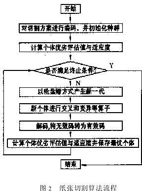 其中Pnj表示在第n個(gè)原紙卷中生產(chǎn)規(guī)格標(biāo)號(hào)為j的新紙卷數(shù)。該模型目標(biāo)是找到一種切割方法使得原總紙卷數(shù)n→min,采用遺傳算法求解該模型的算法流程如圖2所示。