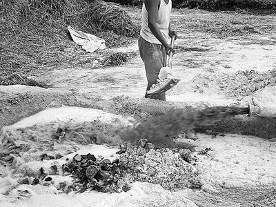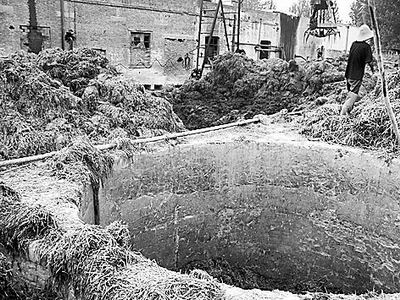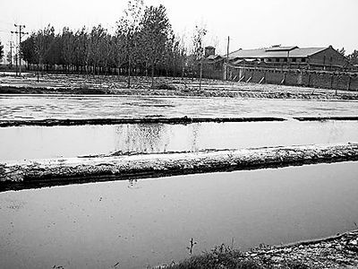 這家造紙廠是侯屯村的集體企業(yè),廠房四周全部是農(nóng)田。生產(chǎn)車間里,幾臺機(jī)器轟鳴著,制出的黃板紙卷成一個(gè)個(gè)大圓桶,堆放在一邊,幾名工人在照看著正在運(yùn)轉(zhuǎn)的機(jī)器。鍋爐房東側(cè)是一堆堆小山似的麥秸稈,十幾名工人正在將麥秸稈向一臺機(jī)器上投送,旁邊8個(gè)洗漿池里堆滿了大量的草漿。洗漿池外,一只小碗口粗的鋼管向外噴出濁黃的廢水。廠區(qū)南側(cè),有一片大的污水存放池,池內(nèi)存滿了造紙廢水。