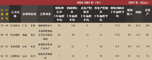調研及排名方法說明: 本調查為《福布斯》中文版針對中國上規模企業進行的獨立調研。 調研范圍:2007年銷售額超過30億元、主營業務在中國大陸的非國有企業。 排名依據:是根據候選企業在2005-2007三年間的回報率指標(總資產回報率、凈資產回報率)、增長性指標(銷售增長率、利潤增長率)和贏利性指標(銷售利潤率)進行加權計算,并根據企業過去3年的銷售規模進行調整,從而得出本排名。