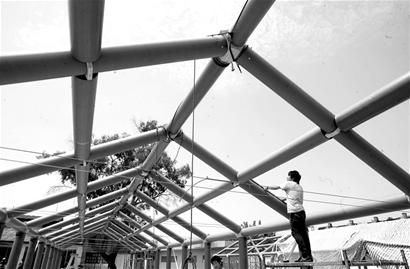 22日下午,成都成華區(qū)崔家店華林小學。校園的右側(cè),不少人正在施工。烈日下,初露線形的新教室結(jié)構(gòu)十分獨特,因為整個建筑主體材料采用的都是紙管。再隔幾日,中國首套紙管教室將在這里落成,孩子們將在紙教室里讀書三年。