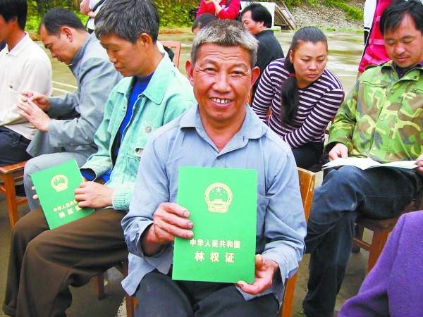 5月5日,龍勝各族自治縣江底鄉地靈村群眾高興地展示新領到的林權證書。當日,該縣在地靈村舉行林權證書首發儀式,共有50多戶農戶成為該縣第一批領到林權證書的對象。自林權制度改革工作開展以來,當地各級黨政高度重視,采取干部包村到點的責任制,廣大林權工作人員不完成任務不出村。目前當地農戶所有山場勘界、繪圖任務已順利完成,這里的群眾將在近期陸續領到具有產權意義的林權證書!跬ㄓ崋T粟成會譚宗革攝