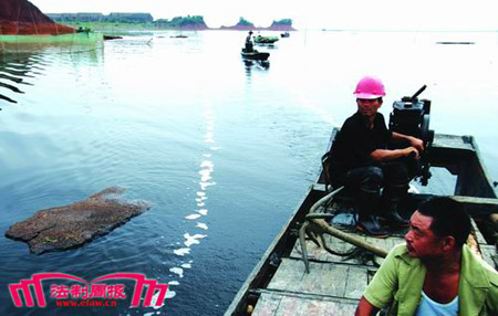 資料圖片:魚船駛過洞庭湖黑色污染帶時,形成一條白色波浪(來源:法制周報)