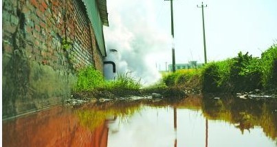 隨后,記者發現一條1.5米左右的污水溝一直延伸到河堤邊。污水呈銀灰色,散發出惡臭。沿著污水溝走了半個多小時后,記者來到了一家造紙廠。正在生產的廠房機器轟鳴,一股冒著熱氣的紅色污水正從碗口大小的墻洞里汩汩冒出,不一會兒另外兩個管道也有同樣的污水排出,水霧繚繞。