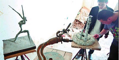 陳余介紹,這些廢紙箱、爛鐵絲、小鐵片、生銹的機器零部件等,都是從廢品收購站淘的,廢銅爛鐵經焊接就成了形態各異的藝術品。陳余說,做雕塑最常用的就是石膏和玻璃鋼,這些材料價格不菲,一般做一個2公斤的雕塑就需100多元錢。而用廢紙打的紙漿照樣可以做雕塑,成本非常低。“藝術品在于它的創意,不在于原材料的奢侈。”陳余和他的同學們都認為,藝術家更應關注生態環境,減少污染和浪費,讓藝術傳遞低碳和環保的意義。