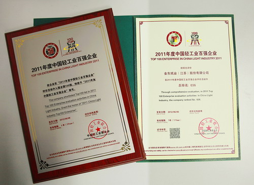 6月6日,中國輕工業百強企業發布暨提升國際競爭高峰論壇在北京舉行。論壇上,中國輕工業聯合會公布了2011年度“中國輕工業百強企業”及“中國輕工業十強企業”榜單,APP金東名列中國輕工業百強企業第36名和中國輕工業造紙行業十強企業。