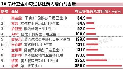 頗有諷刺意味的是,記者發(fā)現(xiàn),臺(tái)灣舒珊衛(wèi)生巾的官網(wǎng)上,列出了關(guān)于熒光劑有致癌危害的內(nèi)容,并表明其產(chǎn)品“絕無(wú)熒光劑”。然而此次檢測(cè)中,這款衛(wèi)生巾的可遷移性熒光增白劑含量高達(dá)386mg/kg,是含量最低的高潔絲的7倍。(如下圖)
