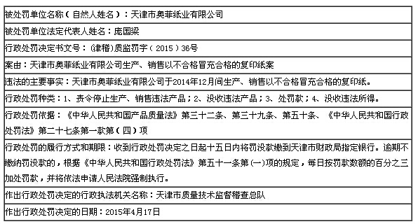 天津市市場和質量監督管理委員會近日公開天津市奧菲紙業有限公司生產、銷售以不合格冒充合格的復印紙案件信息,詳情如下: