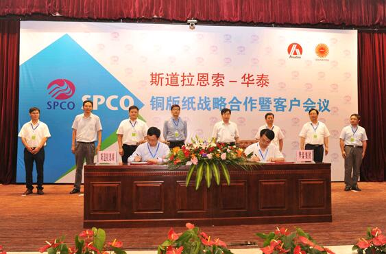 2016年7月8日,斯道拉恩索——華泰銅版紙戰(zhàn)略合作暨客戶會(huì)議在山東東營(yíng)成功舉辦。會(huì)議期間,來(lái)自全國(guó)各地的50多位銅版紙客戶代表,與斯道拉恩索集團(tuán)和華泰集團(tuán)代表一起,共同見(jiàn)證了“蘇州紫興SPCO”品牌的轉(zhuǎn)讓儀式。斯道拉恩索集團(tuán)蘇州工廠總經(jīng)理王自力和華泰集團(tuán)總經(jīng)理魏文光代表合作雙方在品牌轉(zhuǎn)讓備忘錄上簽字。