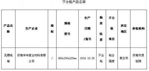 2016年第4季度,濟(jì)南市質(zhì)量技術(shù)監(jiān)督局組織開(kāi)展了瓦楞紙箱(紙板)產(chǎn)品質(zhì)量市監(jiān)督抽查。本次共抽查了全市32家企業(yè)生產(chǎn)的61批次產(chǎn)品。抽查發(fā)現(xiàn)有1家企業(yè)的1批次產(chǎn)品不符合相關(guān)標(biāo)準(zhǔn)的要求,不合格項(xiàng)目涉及“粘合強(qiáng)度”等。