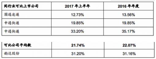 圓通財(cái)報(bào)中并未列出第三季度財(cái)務(wù)數(shù)據(jù),由前三季度減去上半年數(shù)據(jù)得出 雖然韻達(dá)的營(yíng)業(yè)收入低于圓通,但凈利潤(rùn)及增長(zhǎng)速度已高于圓通。 兩者收入差別大,是因?yàn)閮烧吲c同行業(yè)快遞公司的“派送費(fèi)”業(yè)務(wù)模式不盡相同。韻達(dá)在《關(guān)于深圳證券交易所對(duì)公司2017年半年報(bào)問(wèn)詢(xún)函的回復(fù)公告》中解釋道:“公司為攬件/派件加盟網(wǎng)點(diǎn)之間就‘派送費(fèi)’的直接結(jié)算提供技術(shù)平臺(tái),‘派送費(fèi)’相應(yīng)由攬件加盟商網(wǎng)點(diǎn)承擔(dān),公司對(duì)上述‘派送費(fèi)’不確認(rèn)收入、成本。” 也就是說(shuō),由網(wǎng)點(diǎn)雙方支付的“派費(fèi)”并不通過(guò)總部進(jìn)行,不計(jì)入總部的營(yíng)業(yè)收入中,所以營(yíng)收實(shí)際差別并不大。在三通一達(dá)中,中通與韻達(dá)都是采取上述計(jì)算方法,所以導(dǎo)致毛利率大幅高于申通和圓通。