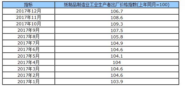 2017年12月全國紙制品制造業工業生產者出廠價格指數
