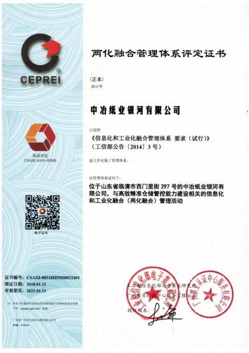 近日,銀河紙業順利通過國家工信部兩化融合管理體系認證,榮獲兩化融合管理體系評定證書。該證書的獲得標志著銀河紙業正式建立起兩化融合管理體系,并在公司信息化與工業化深度融合、培育新動能、提升競爭力等方面邁出堅實的一步。 據悉,銀河紙業兩化融合管理體系貫標工作于2017年2月啟動,在近一年的管理體系建設中,銀河紙業嚴格按照《信息化和工業化融合要求(試行)》及《信息化與工業化融合管理體系評定管理辦法(試行)》要求,相繼編制完成了兩化融合管理手冊、體系文件和兩化融合中長期規劃,成功實施本次評審的“高效精準倉儲管控能力”信息化項目,高標準建立了符合要求的兩化融合管理體系。經過工信部電子第五研究所評估審核、工信部兩化融合專家委員會復核和公示等環節,最終通過了國家兩化融合管理體系評定。