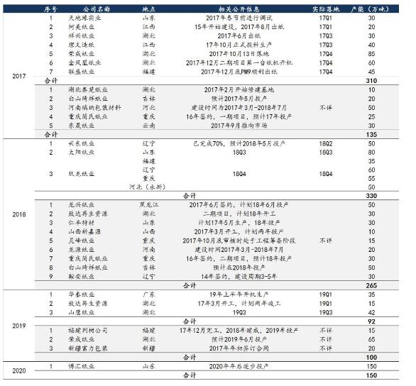 自2018年1月的第二周開始便陸續(xù)有部分基地落實瓦楞、箱板漲價,年后聯(lián)盛、榮成、金鳳凰等也紛紛加入了漲價隊列。 目前來看促使原紙淡季不淡的原因有: (1)產業(yè)鏈庫存低位,年后開工催化供需向好; (2)成本端國廢價格強勢也是支撐紙價上漲的主要原因。 預計對于獲批2018年廢紙進口配額的龍頭企業(yè)來說,1-2月隨著產品價格普漲,進口廢紙陸續(xù)到港,成本優(yōu)勢有所擴大,噸利較去年年底低點已經趨勢向上,現(xiàn)在大家目光將持續(xù)關注于3月進口廢紙政策的執(zhí)行! 廢紙額度多批次、小批量的發(fā)放形式或有利于廢紙和紙價穩(wěn)定 受到春節(jié)期間廢紙停收的額影響,截至2月25日: 國內各地廢紙到廠平均價格2509元/噸(周變化-2元/噸,月變化+43元/噸); 美廢11#外商平均價230美元/噸(本周變化0美元/噸,過去一個月變化-15美元/噸); 隨著3月后0.5%外廢標準的政策執(zhí)行臨近,預期國廢需求上行將推升產品價格。2017年紙價的急漲急跌對下游包裝行業(yè)造成了較大沖擊,平滑紙價波動已經受到國務院、環(huán)保部、造紙協(xié)會等機構的高度重視。環(huán)保部在2017年《限制進口類可用作原料的固體廢物環(huán)境保護管理規(guī)定》的征求意見稿中明確提到,固體廢物進口許可證的頒發(fā)要按季度分批郵寄。東吳證券認為廢紙額度多批次、小批量的發(fā)放形式將有利于廢紙和紙價穩(wěn)定。目前紙價淡季上漲,2018年原紙價格中樞或將大幅上行。 2018年原紙投放產能在300萬噸左右,不必對新增產能過分擔憂 據東吳證券數(shù)據,2017年行業(yè)合計規(guī)劃的新增產能瓦楞箱板在445萬噸左右,而由于環(huán)保政策增加了產能落地的壁壘,目前可跟蹤的投放產能僅300+萬噸;預期2018年隨著環(huán)保邊際趨嚴+原材料受限持續(xù)壓制新增產能投放,市場無需對行業(yè)目前可統(tǒng)計的新增產能過分擔憂。 圖表4:17-19箱板新增產能投放一覽