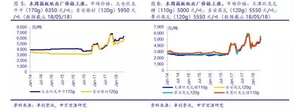 截止5月18日,玖龍、吉安、景興、建暉部分包裝紙報(bào)價(jià)5000-6350元/噸 申萬(wàn)宏源5月20日發(fā)布了周報(bào)。數(shù)據(jù)顯示,上周(5月14日-18日)箱板紙、瓦楞紙價(jià)格仍保持上漲勢(shì)頭。箱板紙終端均價(jià)為6117元/噸,較前一周上漲5.61%。瓦楞紙終端均價(jià)為5364元/噸,較前一周上漲8.06%。灰底白板紙價(jià)格繼續(xù)上漲,終端均價(jià)為5530元/噸,較前一周上漲3.75%。 上周太倉(cāng)玖龍牛卡170g報(bào)價(jià)6350元/噸,天津玖龍瓦楞110g報(bào)價(jià)為5000元/噸,東莞玖龍灰底白板紙終端價(jià)格為5650元/噸。吉安銀杉牛卡120g報(bào)價(jià)5950元/噸,吉安高瓦120g報(bào)價(jià)5550元/噸。景興紙業(yè)高瓦120g報(bào)價(jià)5550元/噸。東莞建暉紙業(yè)灰底白板紙終端價(jià)格5410元/噸。(數(shù)據(jù)截止至5月18日)