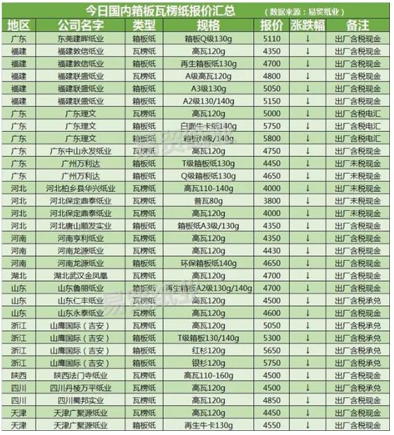 (來源于易貿紙業) 商丘嘉盛紙業:6月5日A級箱板紙價格下調。110g報4400元/噸,125g報4300元/噸,155g報4250元/噸,195g報4200元/噸。(出廠價) 上海兆美紙業:6月5日瓦楞原紙價格下調100元/噸。140g瓦楞紙報4400元/噸。(出廠價) 廣東理文紙業:6月4日高瓦120g報5000元/噸,白面牛卡紙140g報5750元/噸,箱板N級140g報5800元/噸(出廠含稅電匯價)。 東莞建暉紙業:6月4日箱板Q級130g報5110元/噸。(出廠含稅現金價) 中山永發紙業:6月4日高瓦120g報4750元/噸。(出廠含稅現金價) 廣州萬利達紙業:6月4日T級箱板紙130g報4450元/噸,Q級箱板紙130g報4650元/噸。(出廠未稅現金價) 山鷹國際(吉安):6月4日高瓦120g報5050元/噸,T級箱板紙130g/140g報5300元/噸,紅杉120g報5650元/噸,銀杉120g報5750元/噸。(出廠含稅承兌價) 福建聯盛紙業:6月4日A級高瓦120g報4800元/噸,A3級箱板紙130g報5050元/噸,A2級箱板紙130/140g報5150元/噸。(出廠含稅現金價) 福建敦信紙業:6月4日高瓦120g報4350元/噸,再生箱板紙130g報4700元/噸。(出廠含稅現金價) 河北柏鄉縣華興紙業:6月4日高瓦110-140g報4000元/噸。(出廠未稅現金價) 河北保定鼎泰紙業:6月4日普瓦80g報3800元/噸,高瓦120g報4000元/噸。(出廠未稅現金價) 河北唐山順發實業:6月4日箱板紙A3級/130g報4350元/噸。(出廠含稅現金價) 河南亨利紙業:6月4日高瓦120g報4350元/噸。(出廠含稅現金價) 河南龍源紙業:6月4日高瓦120g報4430元/噸,環保箱板紙140g報4650元/噸。(出廠含稅現金價) 湖北武漢金鳳凰:6月4日高瓦120g報4700元/噸。(出廠含稅現金價) 山東魯麗紙業:6月4日再生箱板紙A2級130g/140g報4700元/噸。(出廠含稅現金價) 山東仁豐紙業:6月4日高瓦120g報4500元/噸。(出廠含稅承兌價) 山東永泰紙業:6月4日高瓦120g報4600元/噸。(出廠含稅現金價) 陜西法門寺紙業:6月4日高瓦110g-160g報4500元/噸。(出廠含稅現金價) 四川丹棱萬平紙業:6月4日高瓦120g報4500元/噸。(出廠含稅承兌價) 四川蜀邦實業:6月4日高瓦120g報4850元/噸。(出廠含稅現金價) 天津廣聚源紙業:6月4日高瓦120g報4450元/噸,再生牛卡130g報4550元/噸。(出廠含稅現金價) 浙江杭州民興紙業:6月4日灰底白板紙250g報4260元/噸,300g報4110元/噸,350g報4010元/噸。(出廠含稅價) 河北保定金南紙業:6月3日高瓦110g報4200元/噸,普瓦80g報4000元/噸。(現金含稅出廠價) 天津玖龍紙業:6月3日玖龍瓦楞紙120-170g報4650元/噸,110g報4800元/噸,90g報5000元/噸,70g報5200元/噸;海龍瓦楞紙120g\130g\140g報4500-4600元/噸。(含稅電匯出廠價) 江蘇丹陽長豐紙業:6月3日箱板紙T級110g報5300元/噸,120g報5200元/噸,160g報5150元/噸。(一般出廠含稅承兌價)