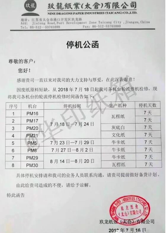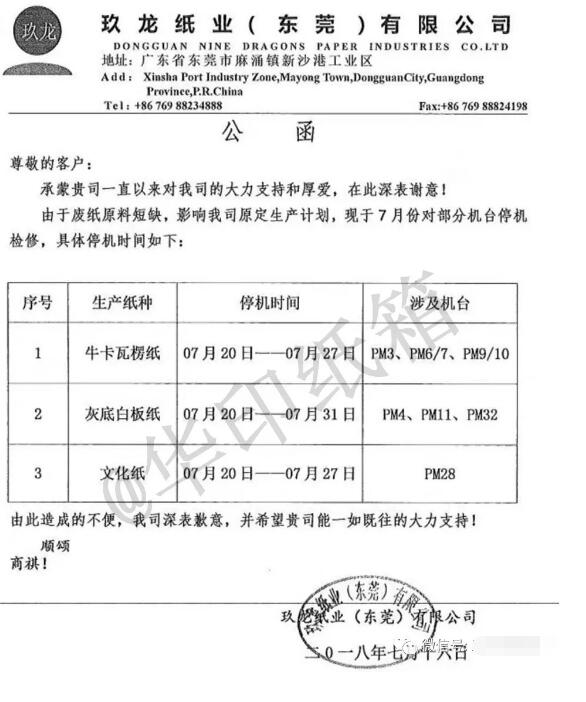 7月16日,龍頭紙企玖龍紙業(yè)連發(fā)兩張公函,宣布旗下兩大生產(chǎn)基地東莞玖龍及太倉玖龍的16臺(tái)紙機(jī)從7月18日至8月20日期間,輪流停機(jī)檢修7-12天不等,涉及紙種為瓦楞紙、牛卡紙、灰底白板紙、文化紙。