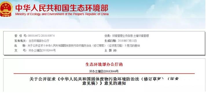 新的固廢污染環(huán)境防治法(修訂草案)已起草 為深入推進(jìn)我國固體廢物污染環(huán)境防治工作,有效防范固體廢物污染環(huán)境風(fēng)險,根據(jù)全國人大立法工作計劃,在認(rèn)真調(diào)查研究的基礎(chǔ)上,我部研究起草了《中華人民共和國固體廢物污染環(huán)境防治法(修訂草案)(征求意見稿)》。 為充分了解各方面意見,進(jìn)一步做好修訂工作,現(xiàn)就《固體廢物污染環(huán)境防治法(修訂草案)(征求意見稿)》(附件1)公開征集意見。 各機關(guān)團體、企事業(yè)單位和個人均可參照意見建議格式(見附件3),向我部提出意見和建議,征集意見截止時間為2018年8月18日。 聯(lián)系人:生態(tài)環(huán)境部熊晶姜棟棟 電話:(010)66556293 傳真:(010)66556252 郵箱:swmd@mep.gov.cn 通信地址:北京市西城區(qū)西直門南小街115號 郵政編碼:100035 附件:1.中華人民共和國固體廢物污染環(huán)境防治法(修訂草案)(征求意見稿) 2.《中華人民共和國固體廢物污染環(huán)境防治法(修訂草案)(征求意見稿)》修訂說明 3.反饋意見建議格式 生態(tài)環(huán)境部辦公廳 2018年7月11日 主要修改內(nèi)容有哪些? 1、增設(shè)生活垃圾分類制度,要求地方政府做好分類投放、分類收集、分類運輸、分類處理體系建設(shè),為推動實施《生活垃圾分類制度實施方案》提供法律支撐; 2、國家實行工業(yè)固體廢物排污許可制度,產(chǎn)生工業(yè)固體廢物的單位須申請領(lǐng)取排污許可證,并按照排污許可證要求管理所產(chǎn)生的工業(yè)固體廢物; 3、按照產(chǎn)生者付費原則,縣級以上地方人民政府可以根據(jù)本地實際建立差別化的生活垃圾排放收費制度; 4、收集、貯存、運輸、利用、處置危險廢物的單位,應(yīng)按照國家有關(guān)規(guī)定,參加環(huán)境污染強制責(zé)任保險。 中華人民共和國固體廢物污染環(huán)境防治法(修訂草案)(征求意見稿) 第一章:總則 第二章:固體廢物污染環(huán)境防治的監(jiān)督管理 第三章:固體廢物污染環(huán)境的防治 第一節(jié):一般規(guī)定 第二節(jié):工業(yè)固體廢物污染環(huán)境的防治 第三節(jié):生活垃圾污染環(huán)境的防治 第四章:危險廢物污染環(huán)境防治的特別規(guī)定 第五章:法律責(zé)任 第六章:附則 第一章總則 第一條:為了防治固體廢物污染環(huán)境,保障人體健康,維護(hù)生態(tài)安全,促進(jìn)經(jīng)濟社會可持續(xù)發(fā)展,制定本法。 第二條:本法適用于中華人民共和國境內(nèi)固體廢物污染環(huán)境的防治。固體廢物污染海洋環(huán)境的防治和放射性固體廢物污染環(huán)境的防治不適用本法。 第三條:國家對固體廢物污染環(huán)境的防治,實行減少固體廢物的產(chǎn)生量和危害性、充分合理利用固體廢物和無害化處置固體廢物的原則,促進(jìn)清潔生產(chǎn)和循環(huán)經(jīng)濟發(fā)展。利用固體廢物不得污染環(huán)境、損害人體健康。國家采取有利于固體廢物綜合利用活動的經(jīng)濟、技術(shù)政策和措施,對固體廢物實行充分回收和合理利用。國家鼓勵、支持采取有利于保護(hù)環(huán)境的集中處置固體廢物的措施,促進(jìn)固體廢物污染環(huán)境防治產(chǎn)業(yè)發(fā)展。 第四條:縣級以上人民政府應(yīng)當(dāng)將固體廢物污染環(huán)境防治工作納入國民經(jīng)濟和社會發(fā)展計劃,并采取有利于固體廢物污染環(huán)境防治的經(jīng)濟、技術(shù)政策和措施。國務(wù)院有關(guān)部門、縣級以上地方人民政府及其有關(guān)部門組織編制城鄉(xiāng)建設(shè)、土地利用、區(qū)域開發(fā)、產(chǎn)業(yè)發(fā)展等規(guī)劃,應(yīng)當(dāng)統(tǒng)籌考慮減少固體廢物的產(chǎn)生量和危害性、促進(jìn)固體廢物的綜合利用,最大限度降低固體廢物填埋處置量。 第五條:國家對固體廢物污染環(huán)境防治實行污染者依法負(fù)責(zé)的原則。固體廢物的產(chǎn)生者對其產(chǎn)生的固體廢物依法承擔(dān)固體廢物污染環(huán)境防治責(zé)任。 第六條:公民應(yīng)當(dāng)增強環(huán)境保護(hù)意識,積極參與固體廢物污染環(huán)境防治,踐行簡約適度、綠色低碳的生活方式,減少固體廢物產(chǎn)生。 第七條:國家鼓勵、支持固體廢物污染環(huán)境防治的科學(xué)研究、技術(shù)開發(fā)、推廣先進(jìn)的防治技術(shù)和普及固體廢物污染環(huán)境防治的科學(xué)知識,制定固體廢物科技專項規(guī)劃,加強固體廢物污染環(huán)境防治科技支撐。各級人民政府應(yīng)當(dāng)加強防治固體廢物污染環(huán)境的宣傳教育,將固體廢物污染環(huán)境防治知識課程納入中小學(xué)教育體系,倡導(dǎo)有利于環(huán)境保護(hù)的生產(chǎn)方式和生活方式。 第八條:國家鼓勵單位和個人購買、使用再生產(chǎn)品和可重復(fù)利用產(chǎn)品。 第九條:各級人民政府對在固體廢物污染環(huán)境防治工作以及相關(guān)的綜合利用活動中作出顯著成績的單位和個人給予獎勵。 第十條:任何單位和個人都有防治固體廢物污染環(huán)境的義務(wù)。對造成固體廢物污染環(huán)境的行為,公民、法人和其他組織有權(quán)向縣級以上人民政府有關(guān)部門舉報。 第十一條:國務(wù)院生態(tài)環(huán)境主管部門對全國固體廢物污染環(huán)境的防治工作實施統(tǒng)一監(ji