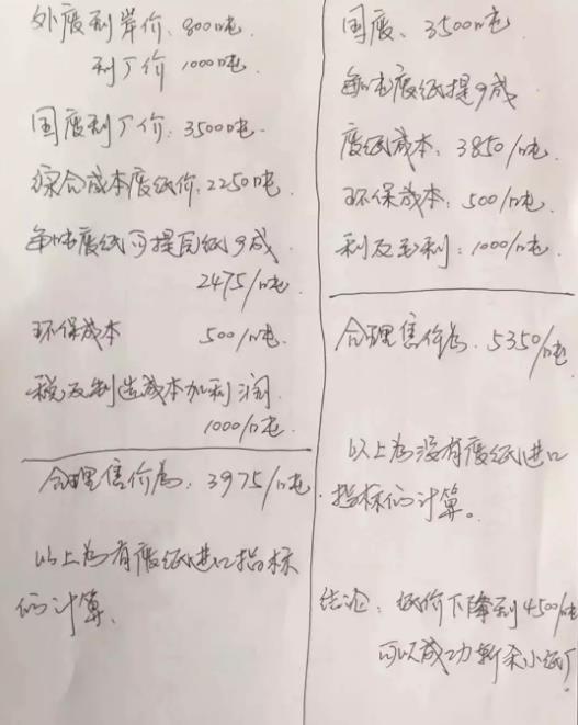 如上報價單,有行業朋友說比同行至少低了10%的,有說平米價差達到0.50元的。總之,這是一張石破天驚的行業超低價。其報價含稅,但做貨前提是——必須是預付款! 筆者做了一下測算,如果五層紙板(160+90+50+90+160)價差0.50元,其原紙均價會比一般紙板廠低多少? 上述紙板五層克重約622g,在報價毛利設定為15%的情況下,紙板價差0.50元,就相當于原紙價差約700元。 要知道,玖龍等大造紙廠,因為有便宜的外廢,按外廢、國廢各占50%的比例,與全部用國廢的造紙廠原紙售價之間的差價,會達到1400元左右。