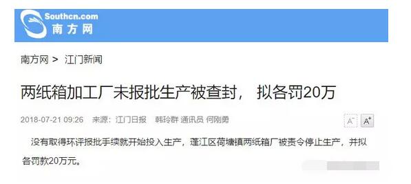 日前,江門市蓬江區荷塘鎮兩家紙箱加工廠因沒有取得環評報批手續就開始投入生產,被責令停止生產,并擬各罰款20萬元。