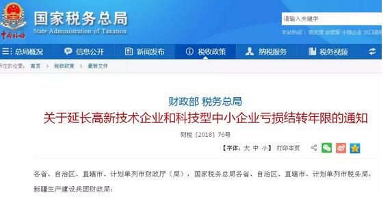 關于延長高新技術企業和科技型中小企業虧損結轉年限的通知 財稅〔2018〕76號 各省、自治區、直轄市、計劃單列市財政廳(局),國家稅務總局各省、自治區、直轄市、計劃單列市稅務局,新疆生產建設兵團財政局: 為支持高新技術企業和科技型中小企業發展,現就高新技術企業和科技型中小企業虧損結轉年限政策通知如下: 一、自2018年1月1日起,當年具備高新技術企業或科技型中小企業資格(以下統稱資格)的企業,其具備資格年度之前5個年度發生的尚未彌補完的虧損,準予結轉以后年度彌補,最長結轉年限由5年延長至10年。 二、本通知所稱高新技術企業,是指按照《科技部財政部國家稅務總局關于修訂印發〈高新技術企業認定管理辦法〉的通知》(國科發火〔2016〕32號)規定認定的高新技術企業;所稱科技型中小企業,是指按照《科技部財政部國家稅務總局關于印發〈科技型中小企業評價辦法〉的通知》(國科發政〔2017〕115號)規定取得科技型中小企業登記編號的企業。 三、本通知自2018年1月1日開始執行。 關于進一步擴大小型微利企業所得稅優惠政策范圍的通知 財稅〔2018〕77號 各省、自治區、直轄市、計劃單列市財政廳(局),國家稅務總局各省、自治區、直轄市、計劃單列市稅務局,新疆生產建設兵團財政局: 為進一步支持小型微利企業發展,現就小型微利企業所得稅政策通知如下: 一、自2018年1月1日至2020年12月31日,將小型微利企業的年應納稅所得額上限由50萬元提高至100萬元,對年應納稅所得額低于100萬元(含100萬元)的小型微利企業,其所得減按50%計入應納稅所得額,按20%的稅率繳納企業所得稅。 前款所稱小型微利企業,是指從事國家非限制和禁止行業,并符合下列條件的企業: (一)工業企業,年度應納稅所得額不超過100萬元,從業人數不超過100人,資產總額不超過3000萬元; (二)其他企業,年度應納稅所得額不超過100萬元,從業人數不超過80人,資產總額不超過1000萬元。 二、本通知第一條所稱從業人數,包括與企業建立勞動關系的職工人數和企業接受的勞務派遣用工人數。 所稱從業人數和資產總額指標,應按企業全年的季度平均值確定。具體計算公式如下: 季度平均值=(季初值+季末值)÷2 全年季度平均值=全年各季度平均值之和÷4 年度中間開業或者終止經營活動的,以其實際經營期作為一個納稅年度確定上述相關指標。 三、《財政部稅務總局關于擴大小型微利企業所得稅優惠政策范圍的通知》(財稅〔2017〕43號)自2018年1月1日起廢止。 四、各級財政、稅務部門要嚴格按照本通知的規定,積極做好小型微利企業所得稅優惠政策的宣傳輔導工作,確保優惠政策落實到位。