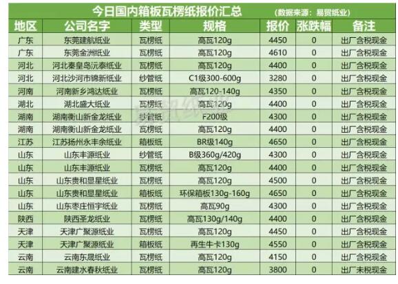 瓦楞箱板上漲行情回顧綜述 7月21至7月27日這一周國內廢舊黃板紙價格保持上漲走勢,漲勢逐漸蔓延。原料價格雖然走高,且供應持續緊張,但需求萎靡不振,下游訂單好轉跡象一般,無力支撐原紙價格推漲,因而這一周多數紙企報價回穩。其中,西南地區因7月20日重慶玖龍下調瓦楞紙價格150元/噸,周邊中小紙企小幅跟跌,區內成交價格下滑100元/噸左右。華東和華中地區產能集中,近期紙企庫存壓力逐漸增大,上周也有小幅下滑50元/噸表現,整體交投氛圍不佳。 7月21至7月27日這一周國內廢舊黃板紙價格保持上揚走勢,受中美貿易商戰影響箱板紙出貨較差,且據貿易商消息稱,本月有不少進口?埖截洠瑢ο浒寮埵袌鰶_擊較為明顯,從而導致本周北方順發和琥珀紙業箱板紙價格均有下調,訂單稍有好轉。另外,華東地區箱板紙出貨較差,部分紙企小幅暗降成交;西南地區跟跌重慶玖龍,均走跌100元/噸。 7月27日紙廠價格一覽: