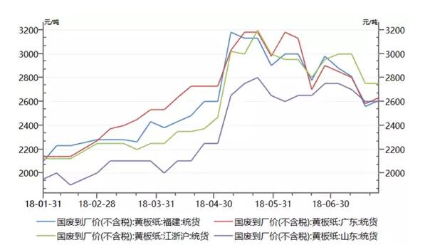 從成本端看,7月份以來,國際木漿價格開始上揚。以歐洲北方漂白針葉漿為例,根據choice最新報價,其價格為1227.5美元/噸(7月27日價格),而在上月同期,該產品價格為1199.99美元/噸。 從成品端看,銅版紙價格近期也打破僵局,目前市場均價為6913.33元/噸。而在此之前,銅版紙均價在6906.67元/噸的位置,維持了近一個月。 有紙業人士表示,目前木漿系紙品(文化紙、白卡紙)仍處于淡旺季交界時期,8月份文化紙等紙種將逐步進入產業旺季,前期紙企停機整修也對庫存起到一定調節作用,加之木漿價格的走高,將對紙品形成價格的支撐。 再看此前紙業的漲價先鋒廢紙系紙種,無論在成本端、還是成品端,其價格走勢也均出現企穩,甚至是反彈的走勢。 以瓦楞紙為例,該品種自今年5月份創下年內新高后,價格開始回落,進入7月份,瓦楞紙市場均價開始企穩,期間一度小幅反彈,目前維持在5148.33元/噸已有半月。而在廢紙系成本端,國廢價格也已經開始反彈,福建、廣東地區黃板紙統貨價格上周單周漲幅50元/噸。