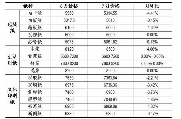 上周國廢黃板紙價格先跌后漲,紙廠廢紙到貨量變化不大,成品紙銷售略微增長后又歸于平淡,紙廠需求興趣有所降溫。隨著旺季來臨,箱板瓦楞紙價格將會有所反彈。 一、白卡紙觸底反彈,瓦楞箱板紙價格待觀望 8月伊始文化紙步入備貨季,主流廠家太陽、晨鳴、APP等紛紛發布漲價函,疊加產業鏈庫存相對較輕,上周雙膠、銅版的單噸價格小幅提漲落地。隨后于8月中箱板及白卡等包裝紙的節日備貨也會開始,但據跟蹤目前終端包裝廠及印刷廠的接單情況持續清淡,對應白卡及箱板主流廠商8月延續限產保價,持續跟蹤后續紙價走勢。