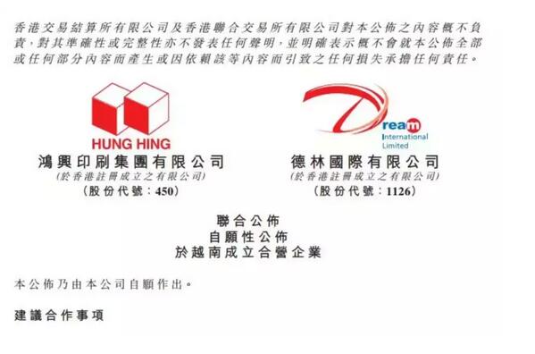 德林國際攜手鴻興印刷成立合營,于越南河內(nèi)從事印刷包裝業(yè)務(wù) 德林國際鴻興印刷公告,2018年8月6日,鴻興印刷與德林國際就成立合營企業(yè)訂立合營企業(yè)協(xié)議,于越南河內(nèi)從事印刷及包裝制造業(yè)務(wù),服務(wù)當(dāng)?shù)丶俺隹谑袌觥W鳛檫M(jìn)一步加強(qiáng)訂約雙方未來合作及方便合營企業(yè)未來運(yùn)作安排,德林承諾于合營企業(yè)期限及其續(xù)期內(nèi)向合營企業(yè)采購紙制品,每年價值將不低于一定數(shù)額。