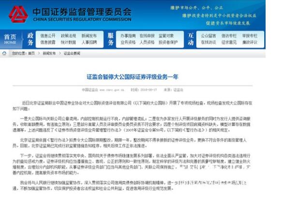 8月17日,銀行間市場交易商協會、證監會同時發布決定,給予大公國際資信評估有限公司(以下簡稱“大公評級”)嚴重警告處分,責令其限期整改,并暫停債務融資工具市場相關業務一年。 證監會新聞發言人常德鵬介紹說,近日北京證監局聯合中國證券業協會對大公國際開展了專項現場檢查。現場檢查發現大公國際存在如下問題: 一是大公國際與關聯公司公章混用,內部控制機制運行不良,內部管理混亂; 二是在為多家發行人開展評級服務的同時為發行人提供咨詢服務,收取高額費用,有違獨立原則; 三是部分高管人員及評審委員會委員資質不符合要求; 四是個別評級項目底稿資料缺失,模型計算存在數據遺漏等。 上述問題違反了《證券市場資信評級業務管理暫行辦法》(2007年證監會令第50號,以下簡稱《暫行辦法》)的相關規定。北京證監局依據《暫行辦法》擬責令大公國際限期整改,期限一年,整改期間不得承接新的證券評級業務,更換不符合條件的高級管理人員。