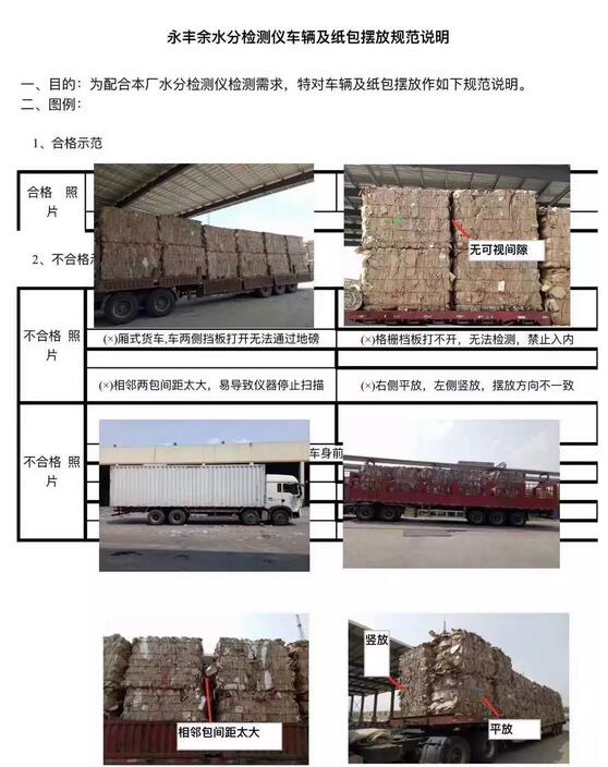 永豐余紙業配合水份儀測試通告 尊敬的供應商,您好! 為了公平、公正地測量廢紙的水分值,減少其他因素影響,保證供需雙方的平等利益,我司將采用在線水分測試儀對國廢進行水分測量。 為保證該儀器的測量準確,請各廢紙供應商配合如下: 1.廢紙包和裝車要求: 1)規則整齊擺放,不要多一包或是少一包,紙包整體是長方形。紙包要求大小一致、松緊度一致、種類等級一致。 2)所有車輛送貨時均為打包好送貨,且裝包數量不允許少于12包。散包車輛不給予測量。 3)車輛裝車兩側應保持平整度,凸起及凹陷落差不允許超過20公分。 4)車輛裝車寬度要求控制在2.4-3.3米。 5)車輛裝車高度范圍:最低3.2米,最高4.5米(從地面到貨物最頂端) 6)紙包與紙包之間的縫隙不允許有可視間隙(3-5cm)。 7)小包車裝車高度為3層 8)如加蓋雨布的車輛,無需拿掉雨布,但必須要把雨布捆扎緊,不得松弛飄動。 9)高欄車/廂式車禁止入廠 10)不可亂掛等級,有明顯亂掛等級、試圖作弊之車輛,罰款 2.運輸車輛的配合要求: 1)公司配有專人負責檢查車輛,請司機朋友配合其工作要求。 2)進口處擺放有警示標志,車輛不得碰到測試探頭,如有損壞,照價賠償(包括材料,安裝等,此設備為全套德國進口)。 以上要求,另附車輛及紙包擺放規范說明的圖例,敬請配合,自8月23日(周四)起,如有不符我司裝車要求導致水份儀無法檢測,增加的人工檢驗成本500元/車,由供應商承擔。 為不影響雙方工作,請各供應商提前做好相關準備,謝謝支持! 永豐余造紙(揚州)有限公司 2018年8月21日